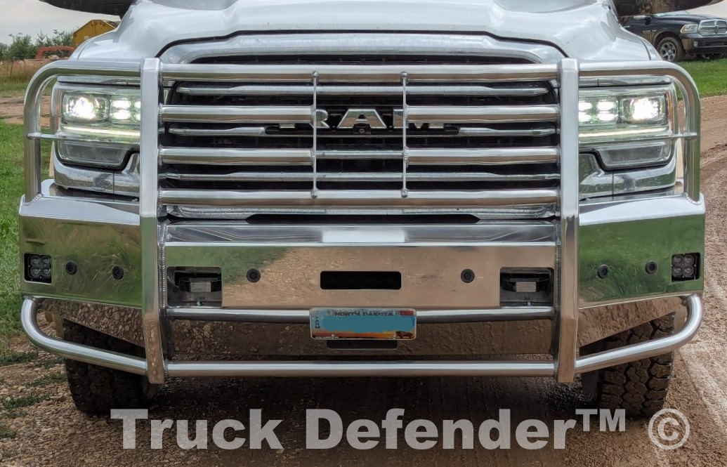 2019 - 2023 Dodge 3500 Foreman Polished, Sensors, 2'' Receiver Tube,Expanded Aluminum Behind Pipes,Hood Pipe,Headlight Straps,Dodge Emblem, Black Oak Light Pods, 1.5'' pipes